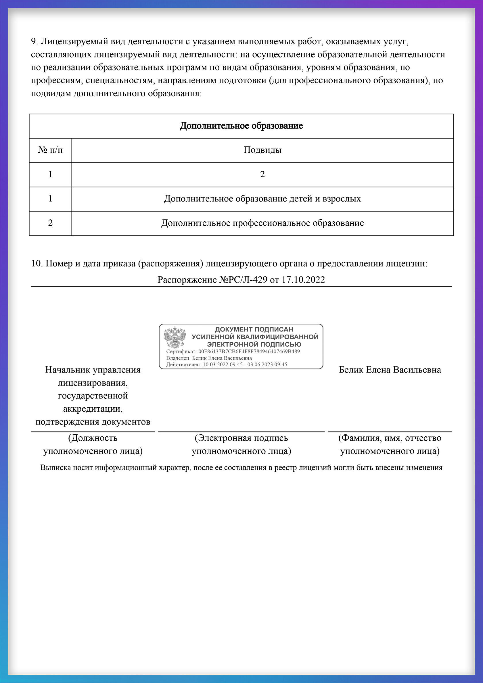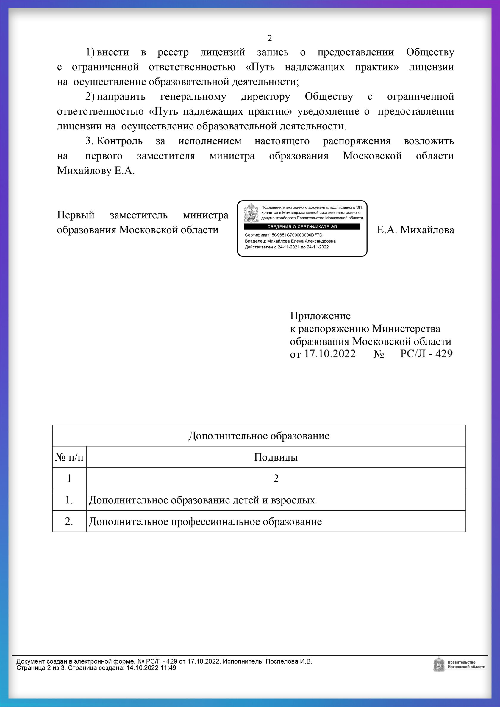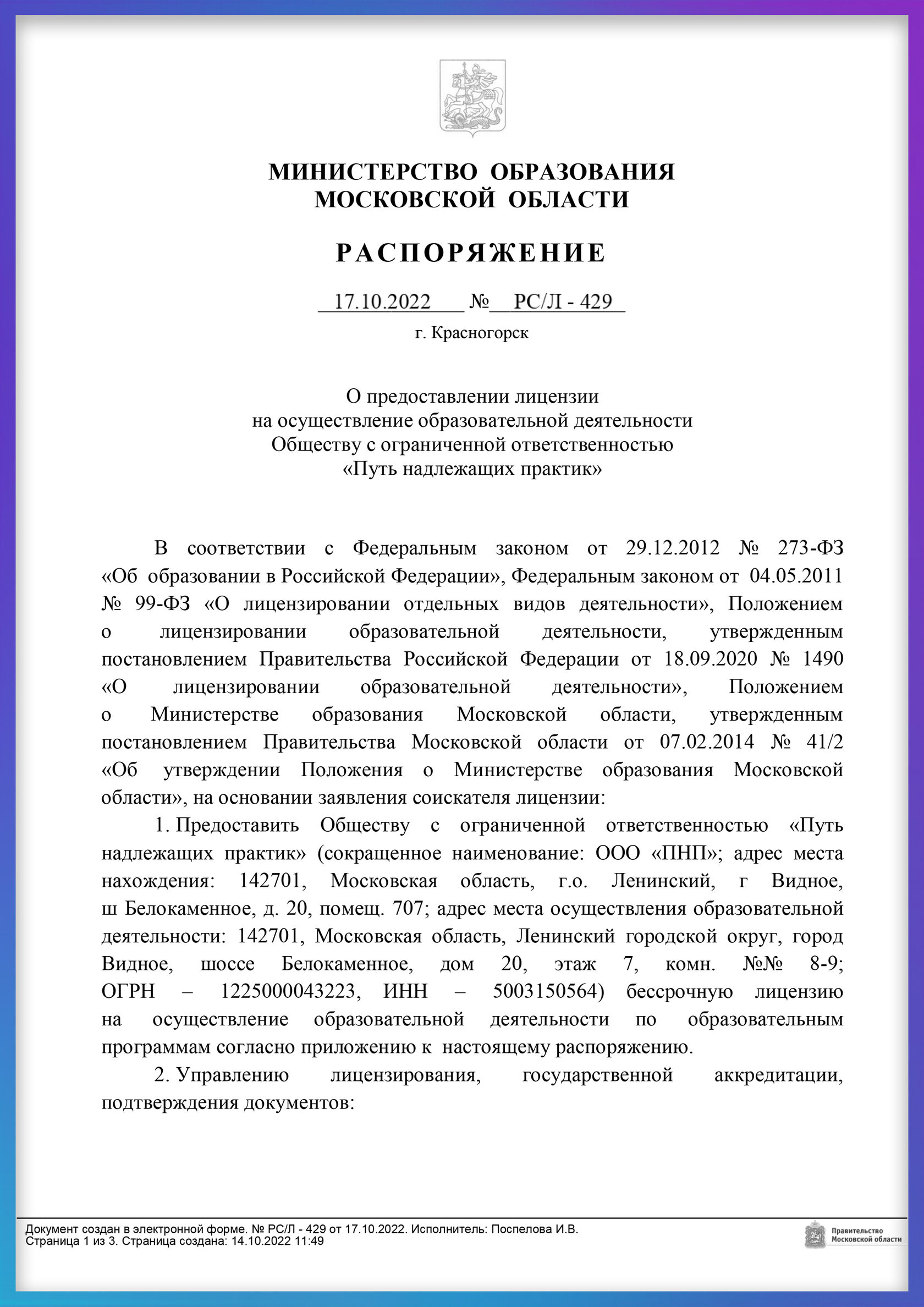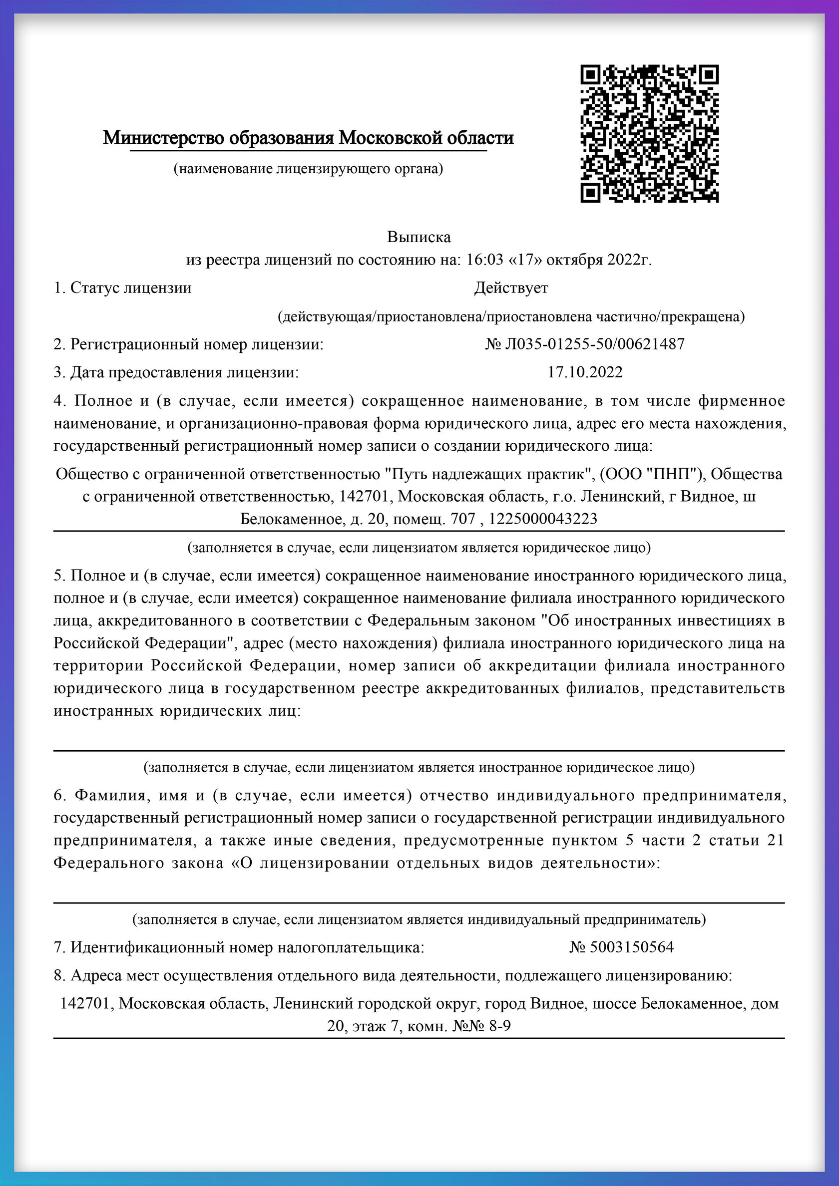 Лицензия на обр. деятельность № Л035-01255-50/00621487 от 17.10.2022 нашей компании в России ООО "Путь надлежащих практик"