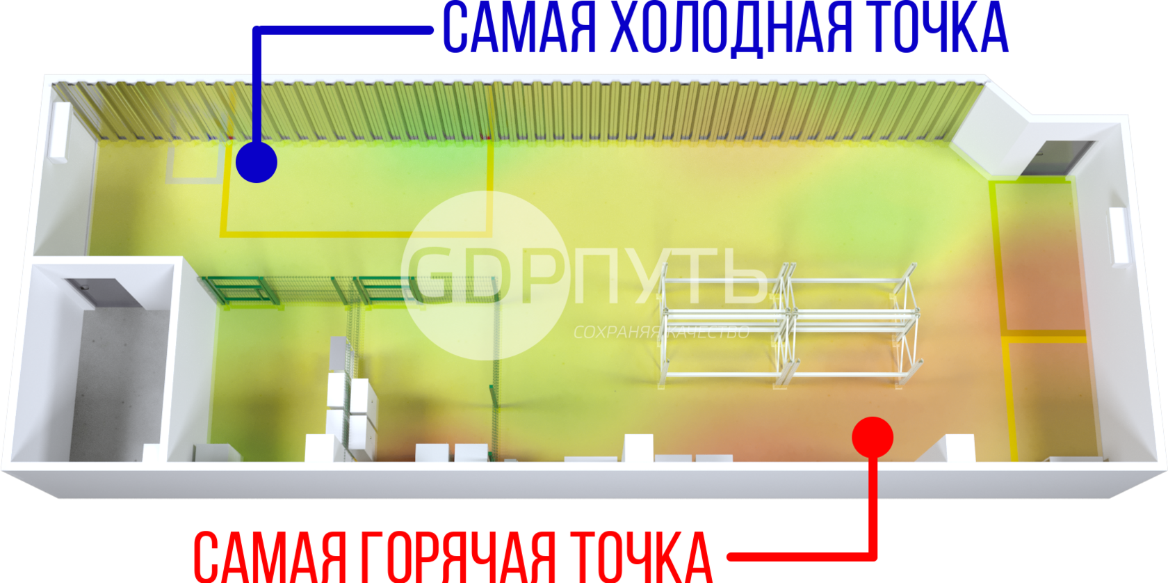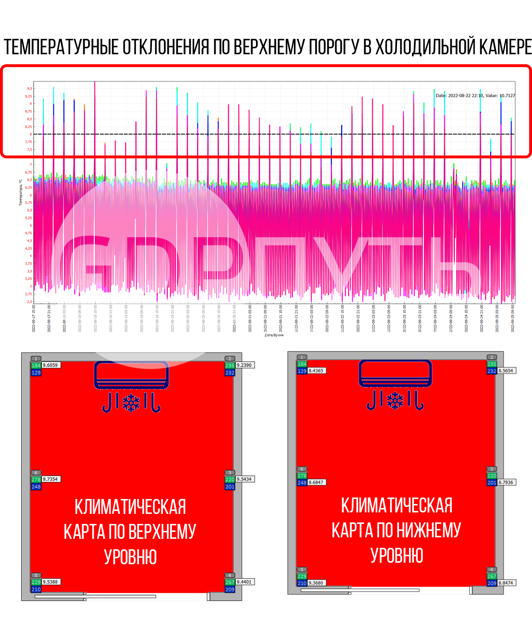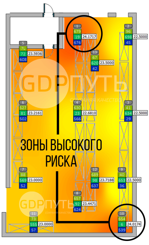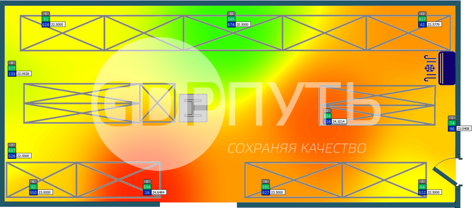 В итоговом отчете отображаются самые теплые и холодные зоны, где и рекомендуется установка датчиков для непрерывного мониторинга и контроля температуры.(Рис. 13) Существуют различные системы мониторинга микроклимата, функциональное назначение которых одинаково, однако стоит обратить внимание на надежность системы, точность передачи данных, удобность в эксплуатации, возможности проведения валидации системы, а также технологических решений предупреждения и оповещения о потенциальных температурных отклонениях и произошедших выходах температуры за установленные предельные значения. Испытав на сотнях объектов, мы рекомендуем к установке систему мониторинга микроклимата «Гигротермон», которая является одной из наиболее распространенных систем мониторинга в странах СНГ, более детальную информацию о которой вы можете найти на нашем