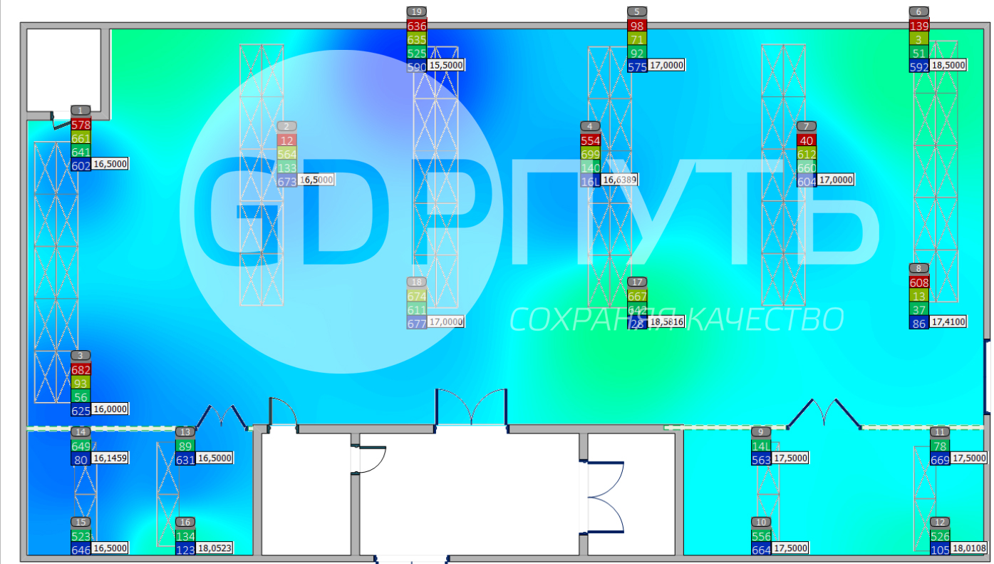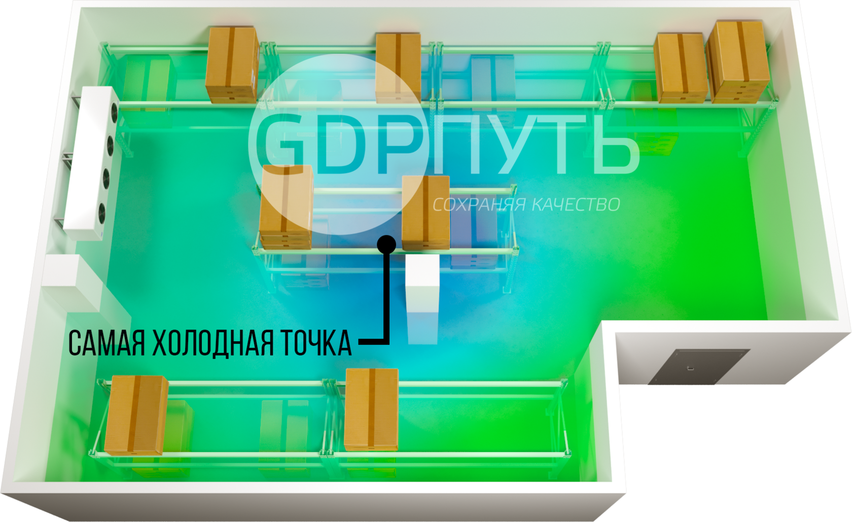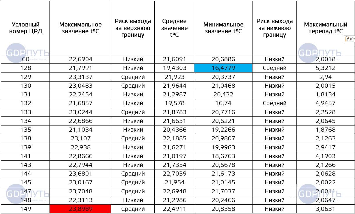 В итоговом отчете отображаются самые теплые и холодные зоны, где и рекомендуется установка датчиков для непрерывного мониторинга и контроля температуры.(Рис. 13) Существуют различные системы мониторинга микроклимата, функциональное назначение которых одинаково, однако стоит обратить внимание на надежность системы, точность передачи данных, удобность в эксплуатации, возможности проведения валидации системы, а также технологических решений предупреждения и оповещения о потенциальных температурных отклонениях и произошедших выходах температуры за установленные предельные значения. Испытав на сотнях объектов, мы рекомендуем к установке систему мониторинга микроклимата «Гигротермон», которая является одной из наиболее распространенных систем мониторинга в странах СНГ, более детальную информацию о которой вы можете найти на нашем
